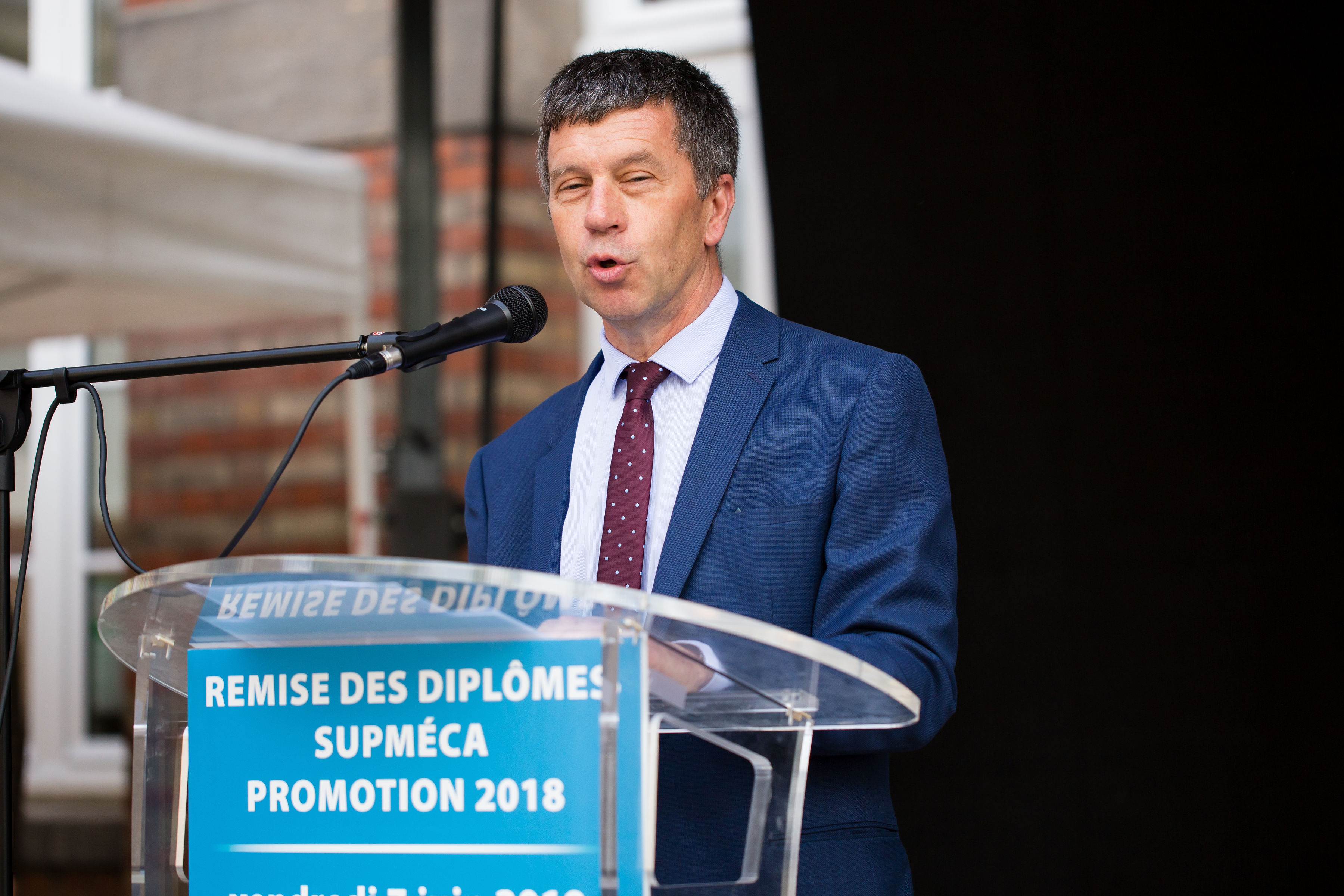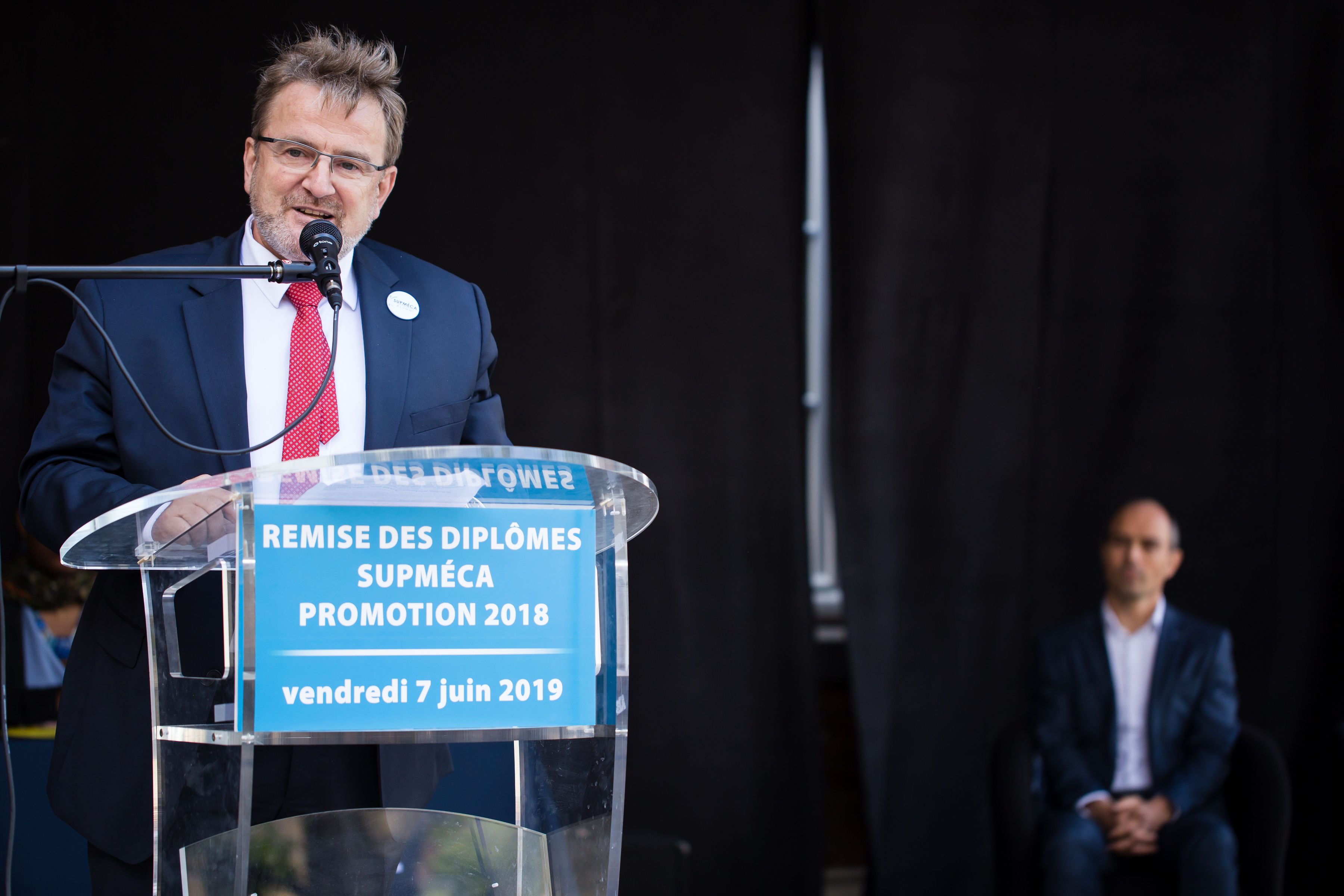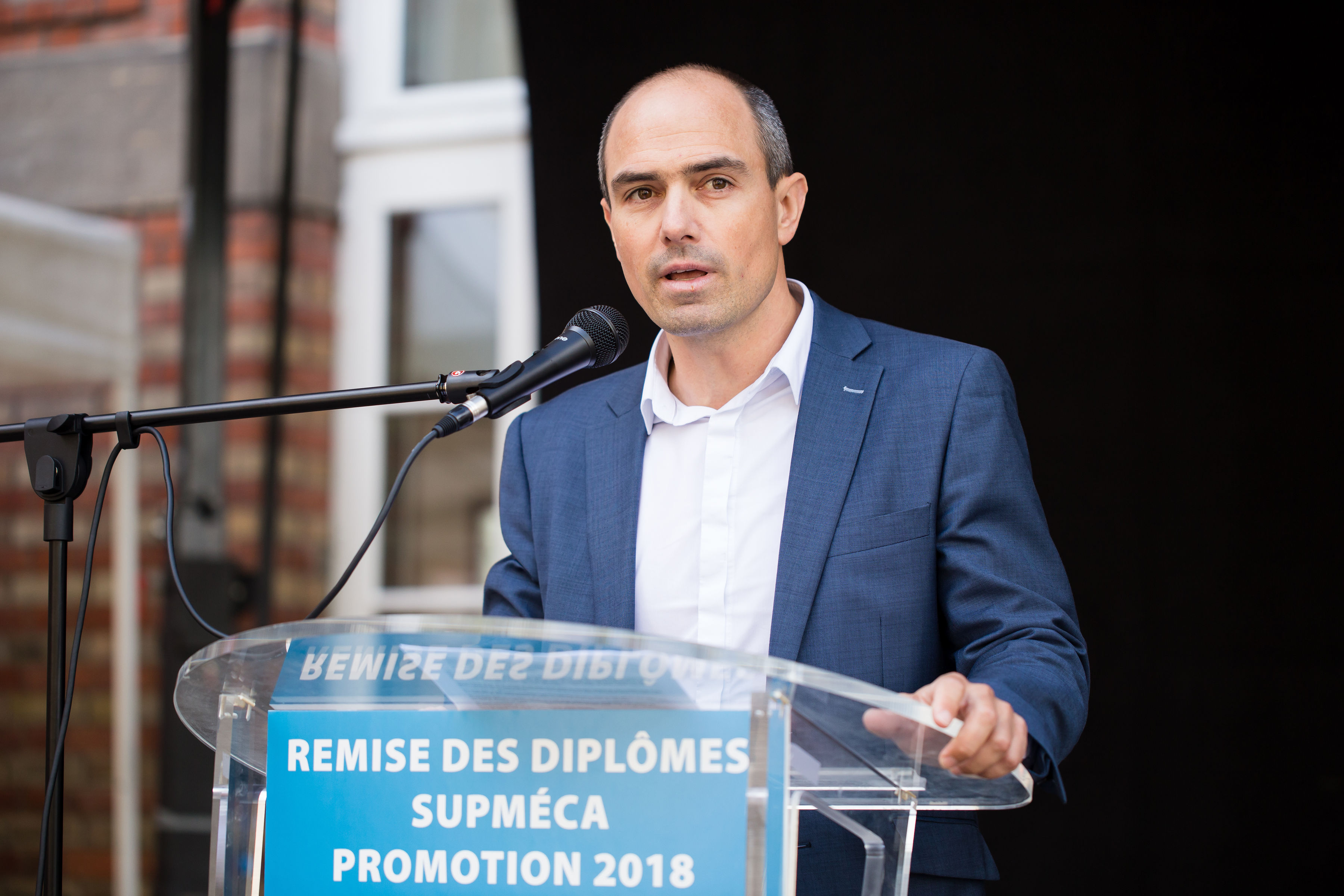 Vincent Holley, parrain de la promotion 2018 a témoigné de son propre parcours : son échec scolaire étant plus jeune et le goût des études retrouvé avec son arrivée à Supméca, qui était son « premier choix ». Dans son discours, l’entrepreneur, fondateur des sociétés System Value et Geeglee, a insisté sur l’importance de la persévérance et de la volonté de réussir.