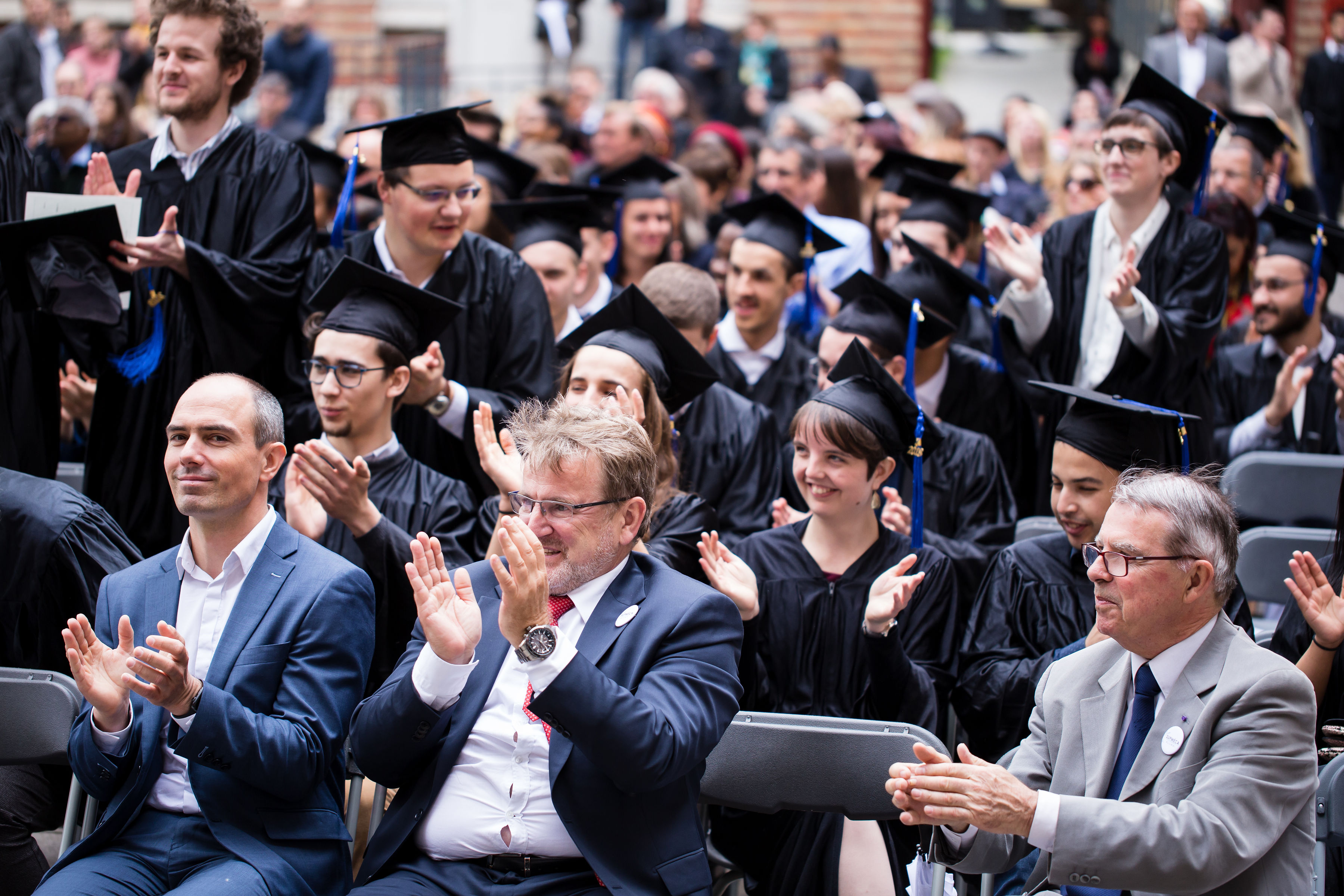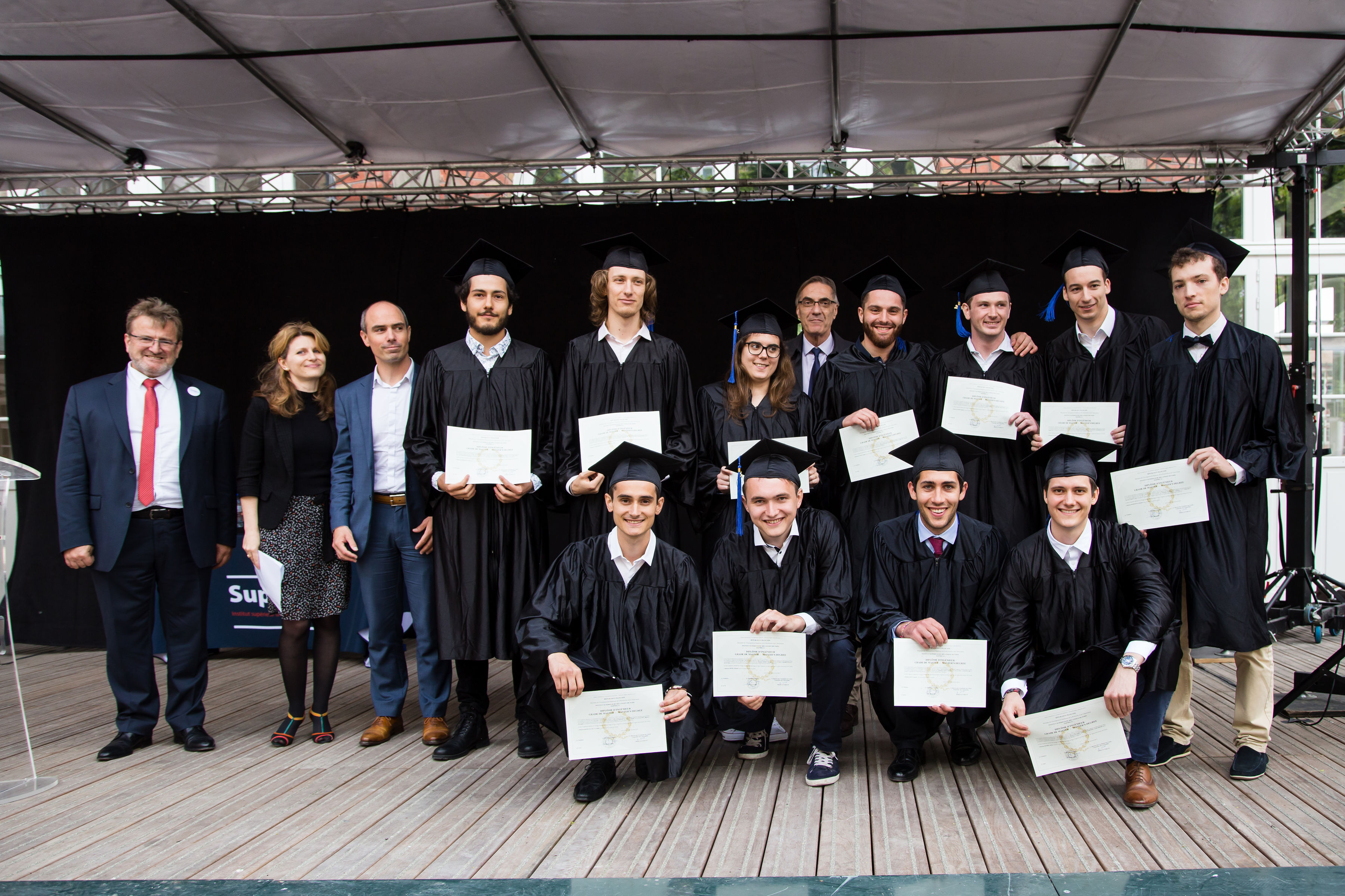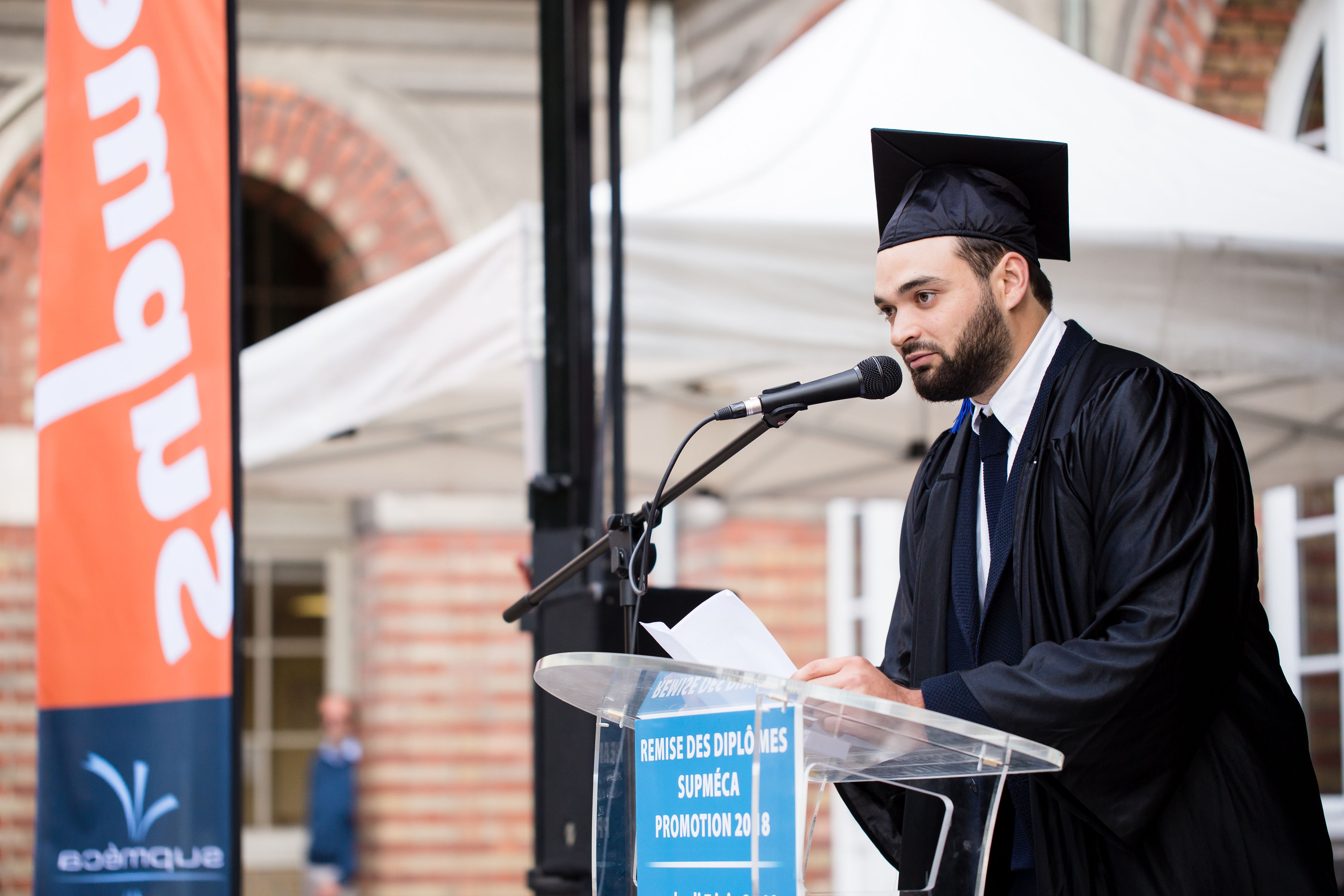 Le 7 juin dernier s’est déroulée la cérémonie de remise des diplômes de Supméca. Les anciens élèves de la promotion 2018, désormais diplômés, sont revenus dans leur école le temps d’une après-midi pour la cérémonie marquant l’obtention de leur diplôme d’ingénieur. Malgré une météo capricieuse, l’événement a réuni dans la cour de Supméca près de 500 personnes : diplômés, familles, invités, personnels de l’école, étudiants… Quelques gouttes et beaucoup de vent n’ont pas empêché les 150 diplômés présents de monter sur scène tour à tour pour recevoir leur diplôme de la main du parrain de promo et du directeur de Supméca.