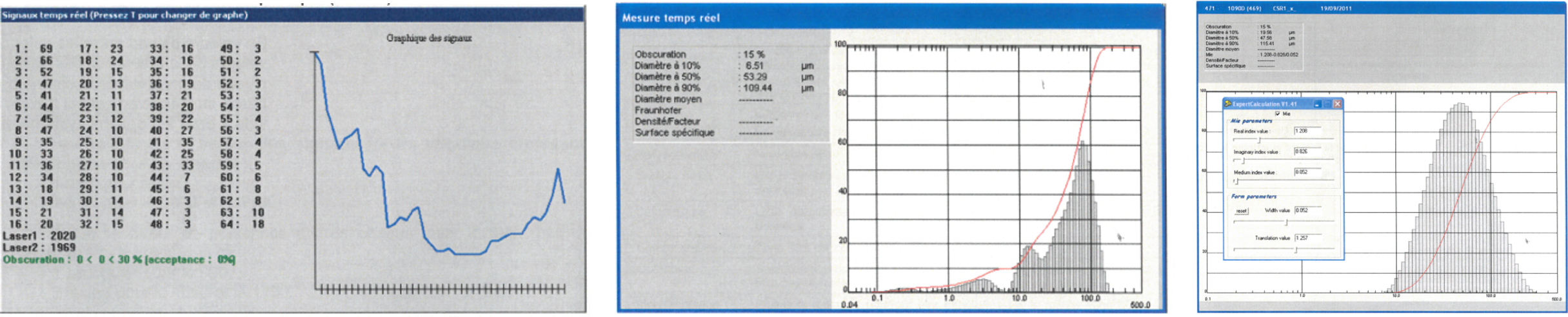 - Principe : diffraction des lumières (laser) par de particules de tailles de 0,04 à 500 µm bien dispersés dans un liquide porteur; quantification basée sur les hypothèses Fraunhofer ou Mie